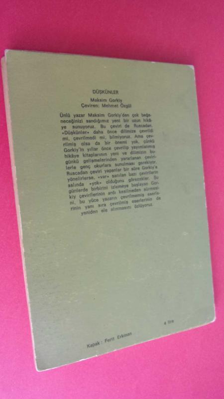 DÜŞKÜNLER 1.baskı, Maksim Gorkiy tarafından kaleme alınmıştır. Kitap 1968 yılında DE YAYINLARI tarafından [isatanbul] yayınlanmıştır. Bu baskının çevirisi Mehmet ÖZGÜL tarafından yapılmıştır. 113 sayfadır. DÜŞKÜNLER 1.baskı adlı eser Türkçe dilindedir.