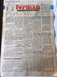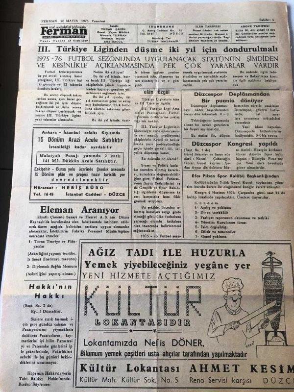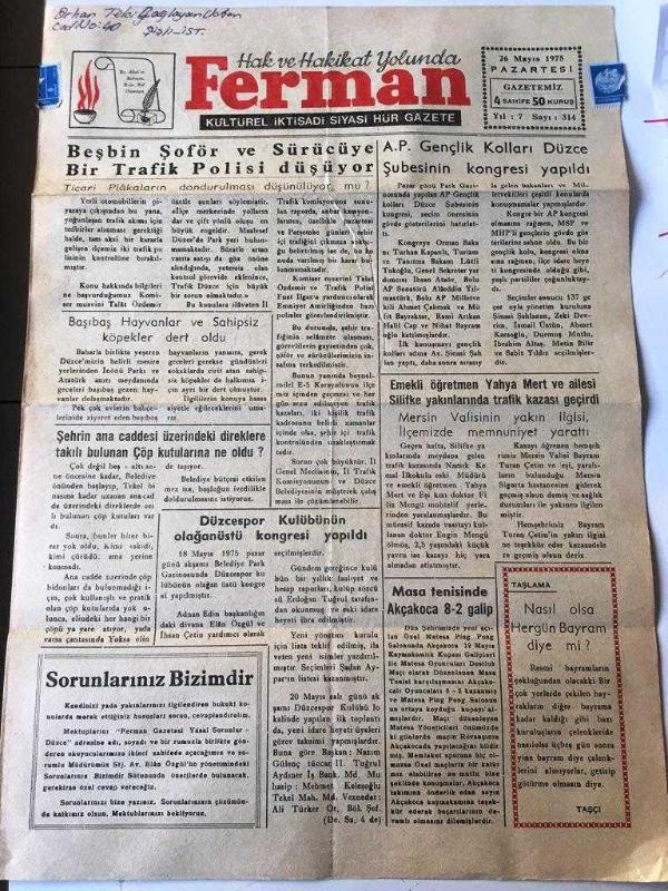 DÜZCE FERMAN GAZETESİ HAK VE HAKİKAT YOLUNDA YEREL TAŞRA BASINI- 26 Mayıs 1975 YIL :7 SAYI :314- Beş bin şoför ve sürücüye bir trafik polisi düşürüyor -Şehrin ana caddesi üzerindeki direklere takılı bulunan çöp kutularına ne oldun? A. P. Gençlik Kolları Düzce Şubesinin Kongresi Yapıldı - Emekli Öğretmen Yahya Mert ve Ailesi Silifke Yakınlarında Trafik kazası Geçirdi -Sanat içinde Sanat :Kerim Özbekler -Balıkçı Hakkı 'nın Hakkı - Anılar Bırakmıyor Yakamı : Niyazi Satık - Sensiz Yaşayamam : Selami Koca -Bizde Tiyatro İlter Veziroğlu --III. Türkiye Liginden Düşme İki Yıl İçin Dondurulmalı - Yıpranma, sararmalar, kupon kesiği ve yırtılmalar zamana bağlı olarak görülebilir.