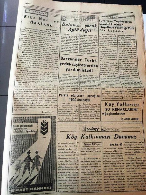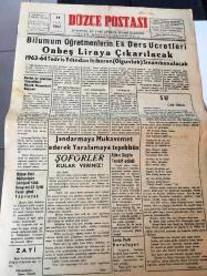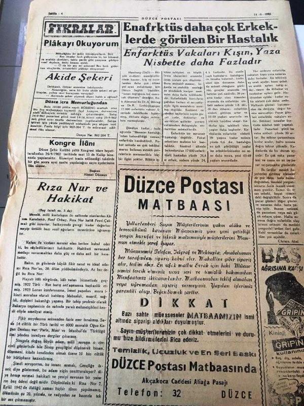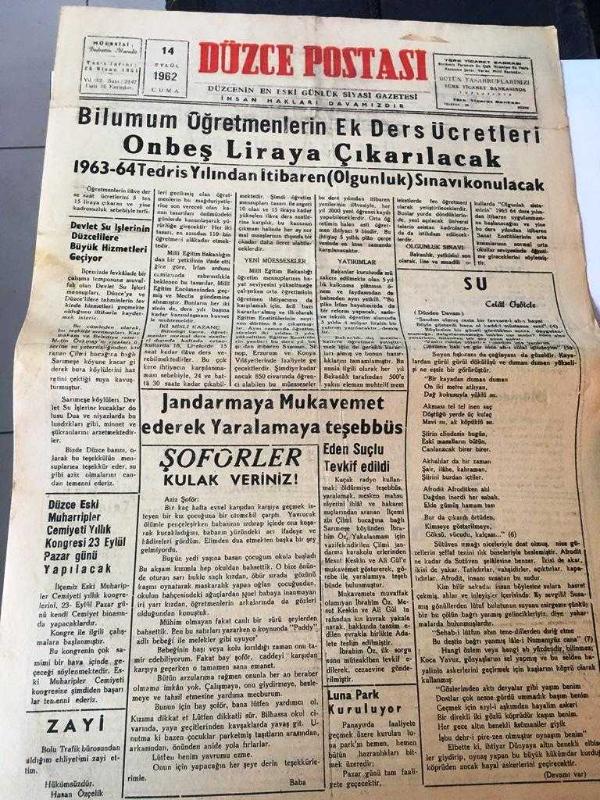 DÜZCE POSTASI GAZETESİ YEREL TAŞRA BASINI - - 14 Eylül 1962 Yıl :12 Sayı :2147--Bilumum Öğretmenlerin Ek Ders Ücretleri On Beş Liraya Çıkacak--Jandarma Mukavemet Ederek Yaralamaya Teşebbüs - -Su :Celal Özdicle --Şiir Köşesi : Kemalettin Kamuk -Sevgiliden :Mevlana --Amerika Türkiye 'nin Elektrik Enerjisi Kaynaklarının Gelişmesine Yardım Edecek --Rıza Nur ve Hakikat :Ahmet Kabaklı--Barzaniler Türkiye 'ye de ki aşiretlerden yardım istedi - Enafrktüs daha çok erkeklerde görülen bir hastalık - Yıpranma, sararmalar, kupon kesiği ve yırtılmalar zamana bağlı olarak görülebilir.