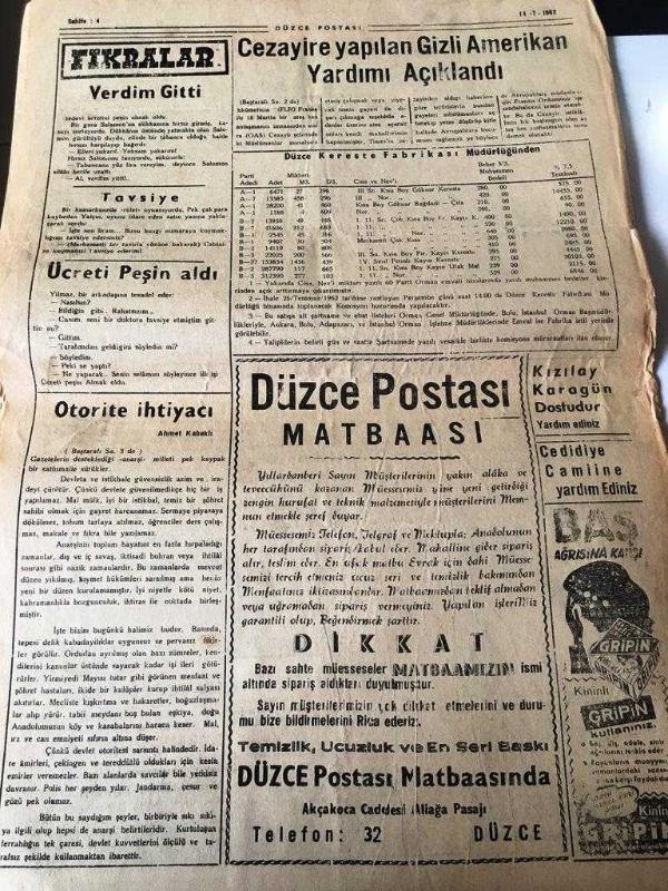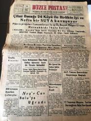 DÜZCE POSTASI GAZETESİ YEREL TAŞRA BASINI - -14 Temmuz 1962 Yıl :12 SAYI :2097- Çilmi Bucağı 24 Köyü İle Birlikte İyi ve Nefis Bir Suya Kavuşuyor -Bu Gece Bütün Yurtta Saatler 24 den İtibaren Bir Saat İleri Alınacak -Şehrimizde darlık yüzünden bir çok dükkanlar zarar edecek --Yugoslavya Sabık Cumhurbaşkanın Düşündükleri --Otorite İhtiyacı :Ahmet Kabaklı - Van da şantiye soyuldu - Köy Kalkınması Davamız :Hasan Bilbaşar-Cezayir de Yapılan Gizli Amerikan Yardımı Açıklandı - Yıpranma, sararmalar, kupon kesiği ve yırtılmalar zamana bağlı olarak görülebilir.
