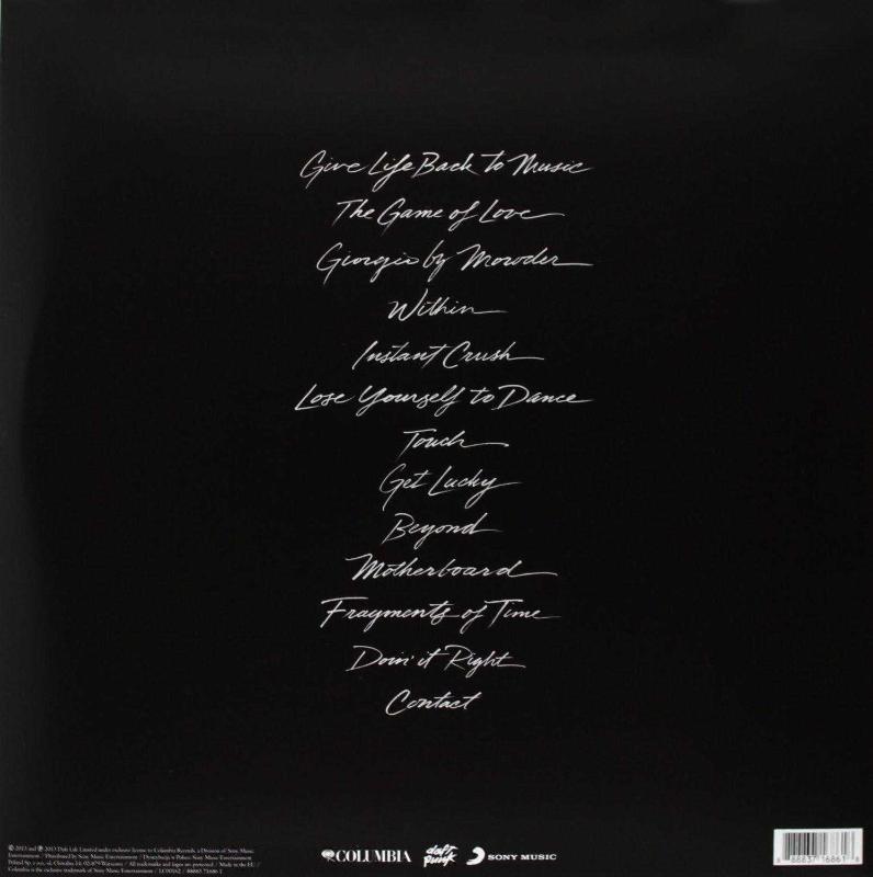 Kullanılmamış LP / plak, orjinal ambalaj ve jelatinindedir, Sony LP: 1 1. Give Life Back to Music 04:35 2. The Game of Love 05:22 3. Giorgio by Moroder 09:04 4. Within 03:48 5. Instant Crush 05:37 6. Lose Yourself to Dance 05:53 7. Touch feat. Paul Williams 08:18 LP: 2 8. Get Lucky Pharrell Williams and Nile Rodgers 06:09 9. Beyond 04:50 10. Motherboard 05:41 11. Fragments of Time 04:39 12. Doin' it Right Panda Bear 04:11 13. Contact 06:23