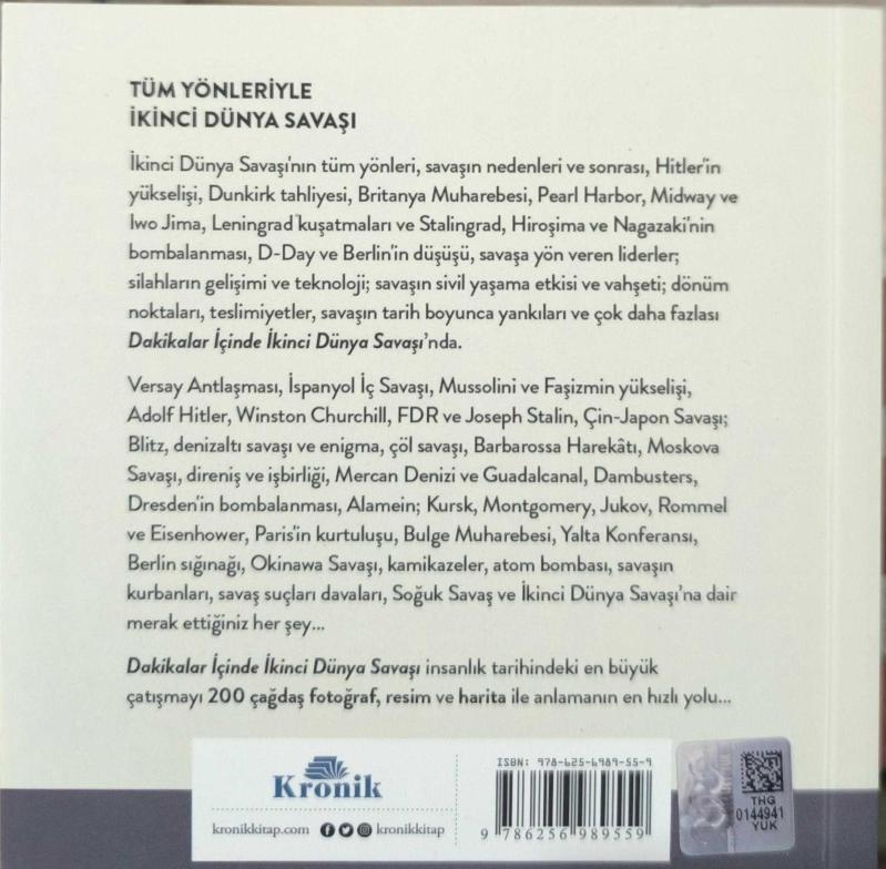 TÜM YÖNLERİYLE İKİNCİ DÜNYA SAVAŞIİkinci Dünya Savaşı'nın tüm yönleri, savaşın nedenleri ve sonrası, Hitler'in yükselişi, Dunkirk tahliyesi, Britanya Muharebesi, Pearl Harbor, Midway ve Iwo Jima, Leningrad kuşatmaları ve Stalingrad, Hiroşima ve Nagazaki'nin bombalanması, D-Day ve Berlin'in düşüşü, savaşa yön veren liderler; silahların gelişimi ve teknoloji; savaşın sivil yaşama etkisi ve vahşeti; dönüm noktaları, teslimiyetler, savaşın tarih boyunca yankıları ve çok daha fazlası Dakikalar İçinde İkinci Dünya Savaşı'nda.Versay Antlaşması, İspanyol İç Savaşı, Mussolini ve Faşizmin yükselişi, Adolf Hitler, Winston Churchill, FDR ve Joseph Stalin, Çin-Japon Savaşı; Blitz, denizaltı savaşı ve enigma, çöl savaşı, Barbarossa Harekatı, Moskova Savaşı, direniş ve işbirliği, Mercan Denizi ve Guadalcanal, Dambusters, Dresden'in bombalanması, Alamein; Kursk, Montgomery, Jukov, Rommel ve Eisenhower, Paris'in kurtuluşu, Bulge Muharebesi, Yalta Konferansı, Berlin sığınağı, Okinawa Savaşı, kamikazeler