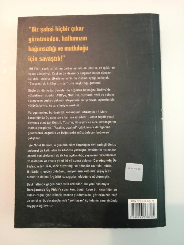 1968'ler. Yazılı tarihin en barbar asrının en umutlu, en ışıklı, en cesur günleriydi. Coşkun bir devrimci dalganın bütün dünyayı sarstığı, onlarca ülkede milyonlarca insanın ayağa kalkarak, "Gerçekçi ol, imkânsızı iste," diye haykırdığı günlerdi... Böyle bir dünyada, Denizler de özgürlük bayrağını Türkiye'de yükseklere taşıdılar. ABD'ye, NATO'ya, yurtlarını yerli ve yabancı sermayeye peşkeş çekmek isteyenlere en iyi cevabı eylemleriyle, yürüyüşleriyle, cesaretleriyle verdiler. Ve egemenler, bu özgürlük kabarışının intikamını 12 Mart karanlığında üç gençten çıkarmak istediler. Somut hiçbir yasal dayanak olmadan Deniz?i, Yusuf?u, Hüseyin?i ve nice arkadaşlarını idamla yargılayıp, "Asalım, asalım!" çığlıklarıyla darağacına göndererek özgürlük ve bağımsızlık mücadelesini boğmaya çalıştılar... Baskı altında geçen yirmi iki yılın ardından, bu yeni basımıyla Darağacında Üç Fidan'ı sunarken, bugün koyu bir karanlığın ve ahlâksızlığın içine itilmek istenen yurdumuzda, gözlerimizde hâlâ bir umut ışığı, darağaçlarında "solmayan" üç fidanın anısı önünde saygıyla eğiliyoruz...