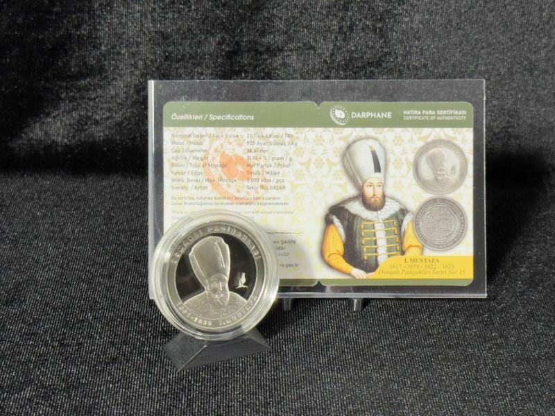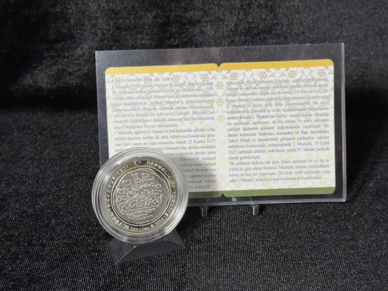 I. Mustafa (1617-1618/1622-1623) Osmanlı Padişahları Serisi No.15 Ürün Özellikleri Metal: 925 AYAR GÜMÜŞ Kenar: TIRTILLI Çap: 38,61 MM Baskı: PROOF Maksimum Baskı Adedi: 3000 Nominal Değer: 20 TÜRK LIRASI Satılan Ürün Adeti: 1000 Ağırlık (Gr.): 31,10 ±% 1GRAM/G