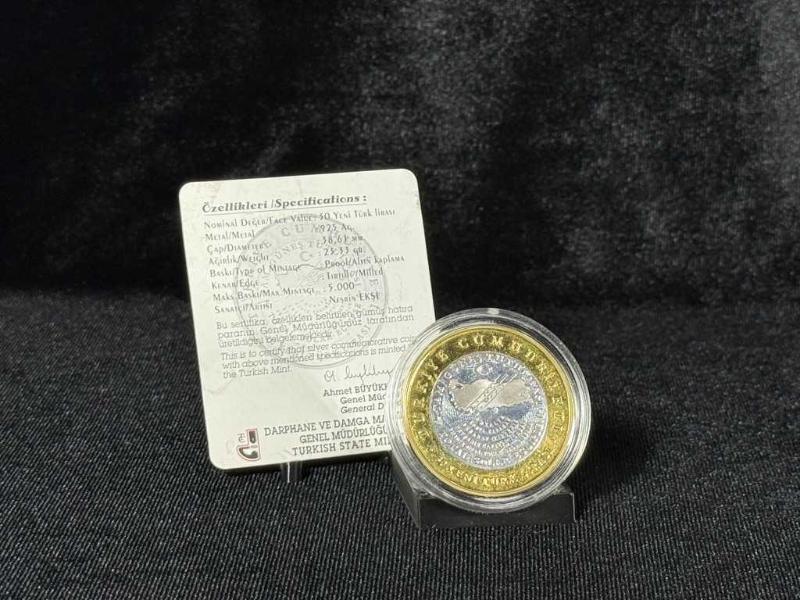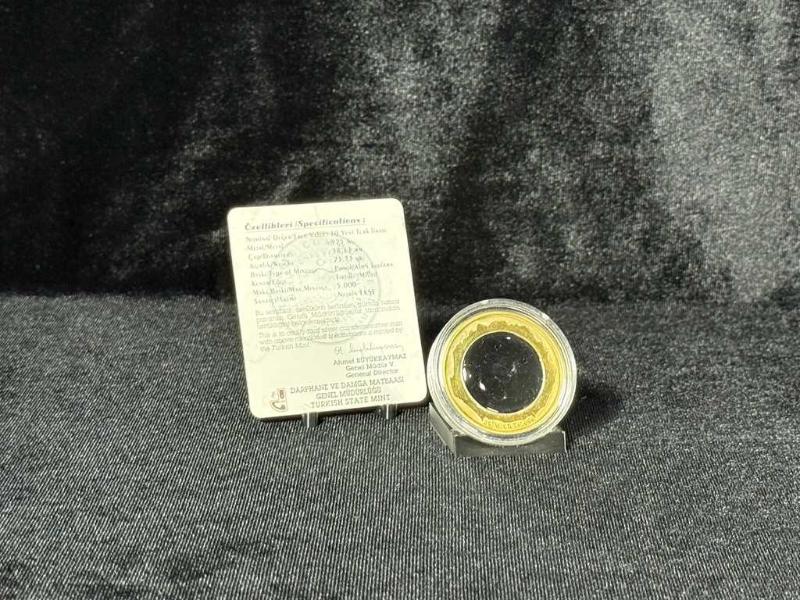 Darphane 2006 Tam Güneş Tutulması – 50 Yeni Türk Lirası Sertifikalı Gümüş üzeri Altın Kaplama Sikke Hatıra Parası 29 Mart 2006 tarihinde Türkiye üzerinden gözlemlenen tam güneş tutulması, gökyüzü meraklıları için eşsiz bir doğa olayıydı. Darphane tarafından bu önemli astronomik olayın anısına basılan 50 Yeni Türk Lirası hatıra parası, hem tasarımı hem de sınırlı basımı ile koleksiyon dünyasında öne çıkıyor. Ön yüzünde tutulma hattının Türkiye üzerindeki güzergahını gösteren detaylı harita yer alırken, arka yüzünde ise tam tutulma anını simgeleyen koyu tonlu, dairesel bir tasarım göze çarpmaktadır. Paranın iç yüzeyi gümüş, dış çerçevesi ise altın kaplamadır. Özellikler: • Nominal Değer: 50 Yeni Türk Lirası • Basım Yılı: 2006 • Maden: %92,5 Gümüş (iç), Altın kaplama (dış) • Ağırlık: 23,33 gram • Çap: 38,61 mm • Baskı Türü: Proof / Parlak • Basım: 2.475 adet • Sanatçı: Nesrin Ekşi • Sertifika: Orijinal numaralı sertifika ile birlikte Koleksiyon değeri yüksek olan bu hatıra parası, hem astronomi meraklıları hem de nadir paraları arayan koleksiyonerler için özel bir anlam taşır. Zamanın gökyüzüne bıraktığı iz, şimdi koleksiyonunuzda ölümsüzleşiyor.