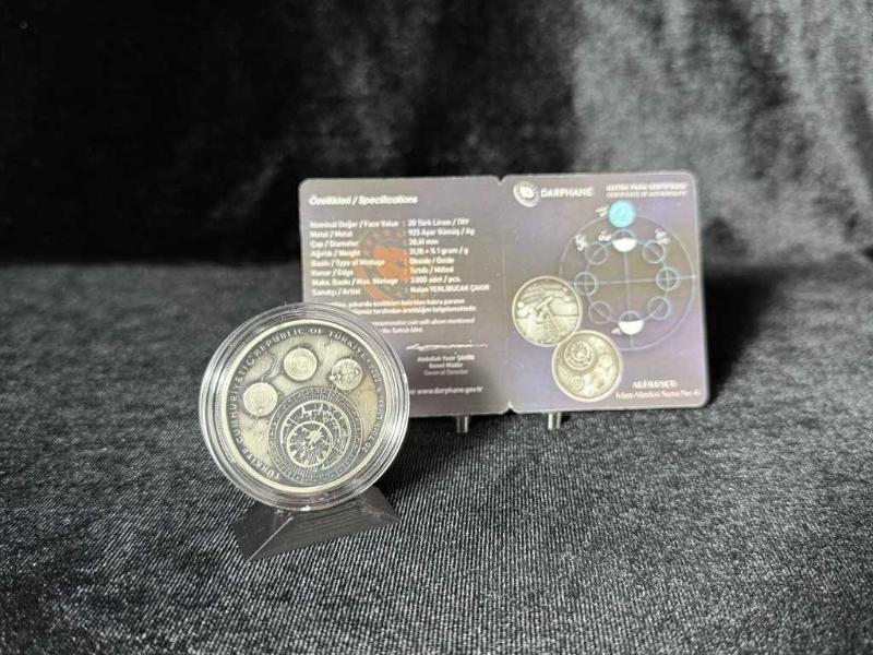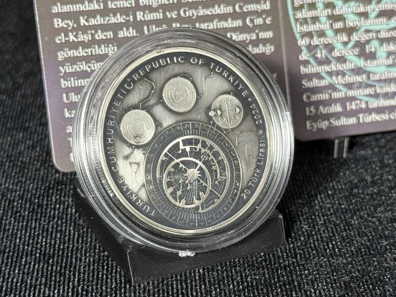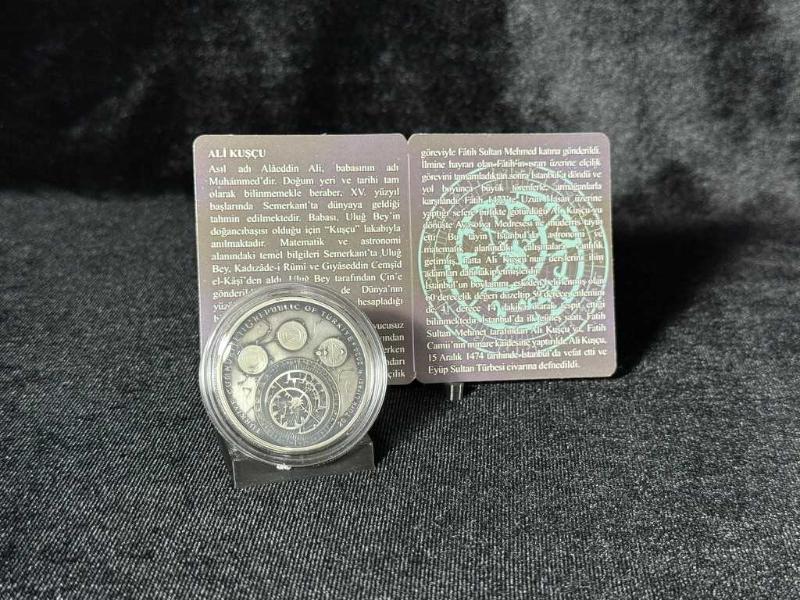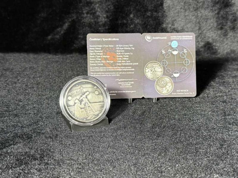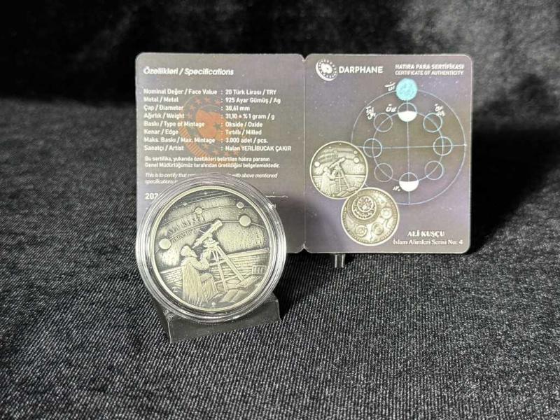 Türkiye Darphanesi - 2024 Ali Kuşçu Hatıra Gümüş Para Ünlü astronom ve matematikçi Ali Kuşçu adına hazırlanan bu özel hatıra para, İslam Alimleri Serisi’nin 4. parçasıdır. • %92,5 saf gümüşten üretilmiştir. • Çap: 38,61 mm | Ağırlık: 31,10 gram. • Sınırlı basım: Sadece 3.000 adet. • Özel okside yüzey işçiliğiyle, detaylar göz alıcı bir şekilde öne çıkıyor. • Her bir para, numaralı orijinallik sertifikası ile birlikte geliyor. Ön yüzünde Ali Kuşçu’nun gökyüzünü gözlem sahnesi, arka yüzünde ise astronomik çizimler yer alıyor. Bu eser, hem sanatı hem tarihi yaşatıyor. Koleksiyonunuzu taçlandırmak, tarihe ve bilime saygınızı göstermek için mükemmel bir parça.