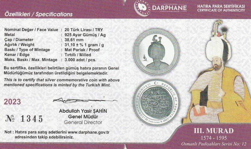 Darphane Osmanlı Padişahları Serisi No:12 Sultan 3.Murad Hatıra Parası Gümüş Sertifika no:1345