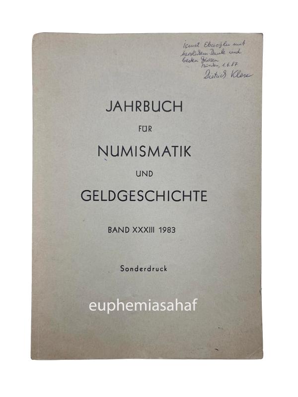 Özgün karton kapağında, temiz durumda, 24 x 17 cm, Almanca, 41-43 sayfa aralığı, 1 s/b levha, yazardan ithafen imzalıdır. "Das Siegel der Mysten des Dionysos Breiseus. Jahrbuch für numismatik und geldgeschichte. Band XXXIII 1983, İMZALI", Dietrich O. A. Klose, Jahrbuch für Numismatik und Geldgeschich, 1983. -- Nümizmatik Nümizmaty Sikke Roma İmparatorluğu.