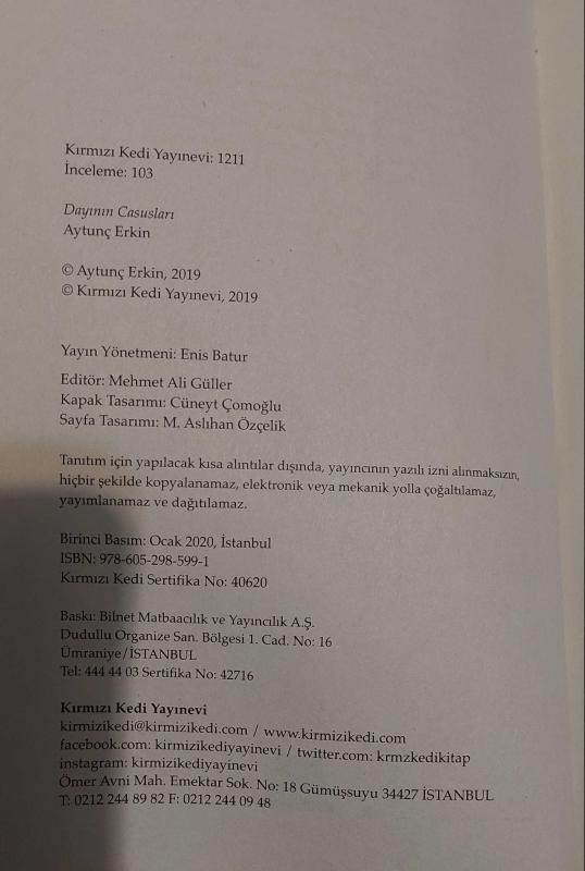 Dayının Casusları, Aytunç erkin tarafından kaleme alınmıştır. Kitap 2019 yılında Kirmizi kedi tarafından [istanbul] yayınlanmıştır. Dayının Casusları adlı eser Türkçe dilindedir.