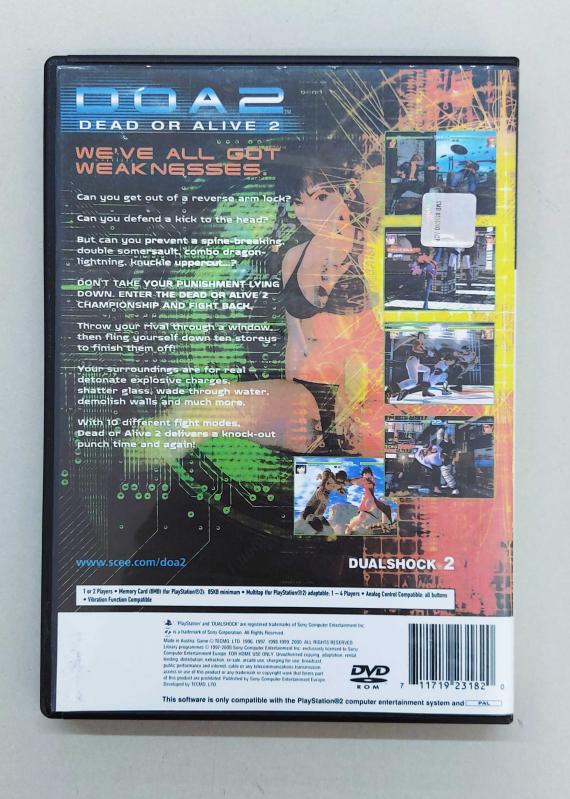 2000 yılında piyasaya sürülen, orijinal PS2 Sony lisans damgalı Dead or Alive 2 oyunu. Diskte kullanıma bağlı oluşan çizikler mevcuttur. Oyun denenmiştir, sorunsuz bir şekilde çalışmaktadır. Son fotoğrafta çalışır halde görüntüsü mevcuttur. Son derece nadirdir. Kutulu PS2 oyunu biriktirenler ve Dead or Alive hayranları için arşivlik bir üründür.