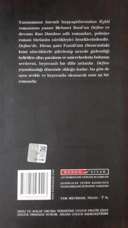 Define, Mehmet Rauf tarafından kaleme alınmıştır. Kitap 2012 yılında Bordo Siyah tarafından yayınlanmıştır. 117 sayfadır. Define adlı eser Türkçe dilindedir.
