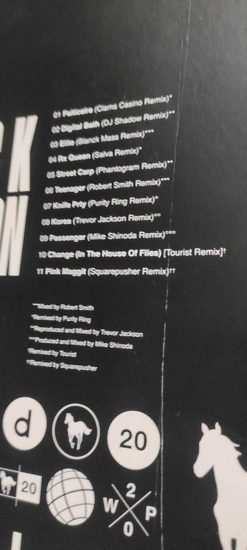 Deftones - White Pony Plak Box Set ( 4 Plak) 20th Anniversary Limited Deluxe Edition Indie Retail Exclusive 4 Plaklık Box Set. 2021, Made In EU Box kutusunda maket bıçağı izi olması sebebiyle açılıp kontrol edilmiştir. Plaklara iğne değmemiştir. Box üzerinde maket bıçağı izi ve ufak tefek ezikler vardır. Plaklar ve kutunun durumu fotoğraflarda gördüğünüz gibidir. Track List LP: 1 1. Feiticeira 2. Digital Bath 3. Elite 4. Rx Queen 5. Street Carp 6. Teenager LP: 2 1. Knife Prty 2. Korea 3. Passenger 4. Change (In the House of Flies) 5. Pink Maggit LP: 3 1. Feiticeira (Clams Casino Remix) 2. Digital Bath (DJ Shadow Remix) 3. Elite (Blanck Mass Remix) 4. Rx Queen (Salva Remix) 5. Street Carp (Phantogram Remix) 6. Teenager (Robert Smith Remix) 7. Knife Prty (Purity Ring Remix) 8. Korea (Trevor Jackson Remix) LP: 4 1. Passenger (Mike Shinoda Remix) 2. Change (In The House Of Flies) [Tourist Remix] 3. Pink Maggit (SquarepushermRemix)