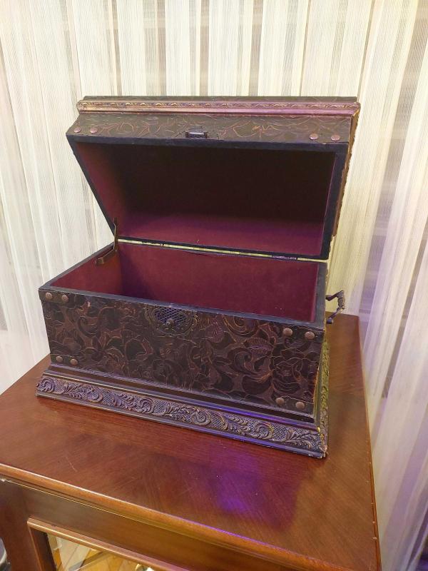 Dekoratif çok şık ahşap dışı işlemeli orta boy ağır içi kadifeli kapaklı orta boy sandık.Ürünün boyu yerden yüksekliği tam 25 Cm'dir.Eni 40 Cm'dir.Derinliği ise 24 Cm'dir.İçerisinin eni 33 Cm'dir.Sağ ve Sol Kenarlarında metal vintage kulpları vardır.Ahşap üzeri Deri kaplamadır.Ürünün ön bölümündeki metal kilit bölümündeki açılıp kapanan kilit kırıldığı için açılan kapanan kilit başlığı yoktur.Fakat,anlayan ya da ben yaparım diyen var ise çok kolay bir şekilde kilit takılabilir.Ürünün kilitli veya kilitsiz hali,ürünün Orijinalliğini asla bozmamaktadır.Tüm kenar bölümlerinde ayrı bir işçilik kullanılarak bakır çivilerle kuvvetlendirilmiştir.Özenle paketlenecektir.Diğer ilânlarımı incelemeyi unutmayınız.