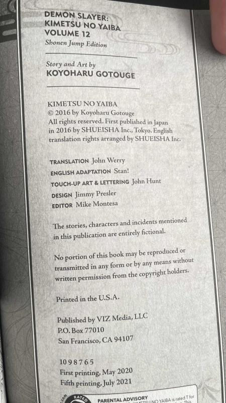 Demon Slayer: Kimetsu no Yaiba Volume 12 - Shonen Jump Edition - Manga - English - Softcover - By Koyoharu Gotouge - VIZ Media, Koyoharu Gotouge tarafından kaleme alınmıştır. Eser Mike Montesa editörlüğünde hazırlanmıştır. Kitap 2021 yılında VIZ Media tarafından [U.S.A.] 9781974711123 ISBN kodu ile yayınlanmıştır. Satışta olan kitap, yayınevinin 5. baskısıdır. Bu baskının çevirisi John Werry tarafından yapılmıştır. 192 sayfadır. Sayfa bilgisi 3. Hamur olarak belirtilmiştir. Demon Slayer: Kimetsu no Yaiba Volume 12 - Shonen Jump Edition - Manga - English - Softcover - By Koyoharu Gotouge - VIZ Media adlı eser İngilizce dilindedir.