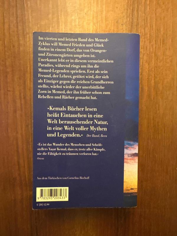 Memed versucht, Frieden und Glck zu finden, und zieht von den Bergen herunter, wo er auerhalb des Gesetzes gelebt hat. Am Mittelmeer will er ein neues Leben beginnen, in einem Dorf, das von Orangen- und Zitronengrten umgeben ist. Die alte Hr und Seyran, die ein Kind erwartet, gesellen sich zu ihm. Unerkannt lebt er in diesem vermeintlichen Paradies ein beschauliches Leben, whrend rings um ihn die Memed-Legenden sprieen und ihm seine eigenen Heldentaten erzhlt werden. Doch der geheimnisvolle Fremde, der Memed immer wieder ber den Weg luft ist er ein Freund oder ein Feind Oder ist er einfach der Memed von einst, der von nichts anderem als von Gerechtigkeit trumte Als sein Freund, der Lehrer, gettet wird, der sich als Einziger gegen die reichen Grundherren stellte, wchst wieder der unerbittliche Zorn in Memed, der ihn frher schon zum Rebellen und Rcher gemacht hat. Doch in dieser Welt haben Legenden keinen Platz mehr und das Wort und die Ehre gelten nichts. Memed zieht zum allerletzten