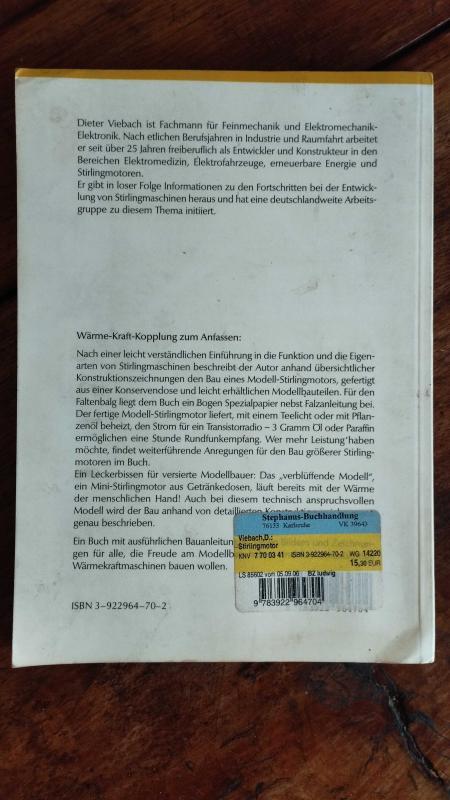Der Stirlingmotor / Stirling motoru, Dieter Viebach tarafından kaleme alınmıştır. Kitap 2006 yılında Ökobuch Faktum tarafından yayınlanmıştır. 102 sayfadır. Der Stirlingmotor / Stirling motoru adlı eser Almanca dilindedir.