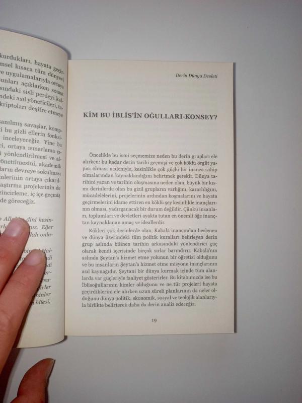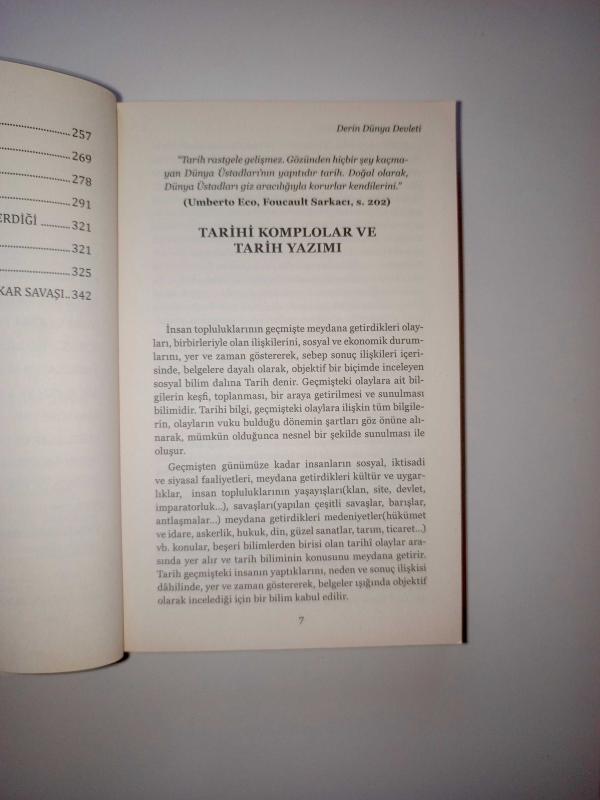 Kitap Tanıtım Yazısı (Arka Kapak): "Tarih rastgele gelişmez. Gözünden hiçbir şey kaçmayan Dünya Üstadları'nın yapıtıdır tarih. Doğal olarak, Dünya Üstadları giz aracılığıyla korurlar kendilerini." (Umberto Eco, Foucault Sarkacı, s. 202) Derin Dünya Devleti nedir? Derin Dünya Devleti, dünyada yaşanan büyük olaylarda ve dünya tarihi üzerindeki rolü nedir? Kripto siyasetçiler, iş adamları, medya patronları Derin Dünya Devleti'ne nasıl maddi ve istihbari destek verir? Dünya üzerinde yaşanılan ve yaşanılmış savaşlar, komplolar, suikastlar, darbeler üzerindeki bu gizli ellerin fonksiyonu nedir? FED kimler tarafından yönetilir, neden FED'in kararları dünyayı etkiler? Dünyayı yönettiği iddia edilen ailelerin ekonomiyi, uluslararası siyaseti kontrol etmek için yaptığı örtülü operasyonlar nelerdir? Konsey; CFR (Dış İlişkiler Konseyi), Trilateral (Üçlü Komisyon), Bilderberg Group, DB (Dünya Bankası), IMF (Uluslararası Para Fonu) BM, AB, NATO, WTO (Dünya Ticaret Örgütü) gibi örgütleri formal ve informal olarak nasıl kullanıyor? DAEŞ ile savaşılıyor mu yoksa faydalanılıyor mu? Türkiye'yi bekleyen jeopolitik, jeostratejik, teolojik, etnik ve mezhebi tehlikeler nelerdir? Bunlar gibi pekçok sorunun cevabını bu kitapta bulacak ve dünyadaki gelişmelere bir de bu gözden bakmak isteyeceksiniz.