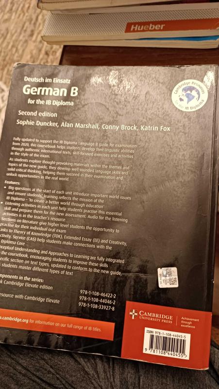 Kitap 2018 yılında Cambridge Universty Press tarafından yayınlanmıştır. 360 sayfadır. Deutsch im Einsatz Coursebook with Cambridge Second Edition: German B for the IB Diploma adlı eser Almanca dilindedir. Eserin içeriğinde İngilizce dilinde bölümlere de yer verilmektedir.