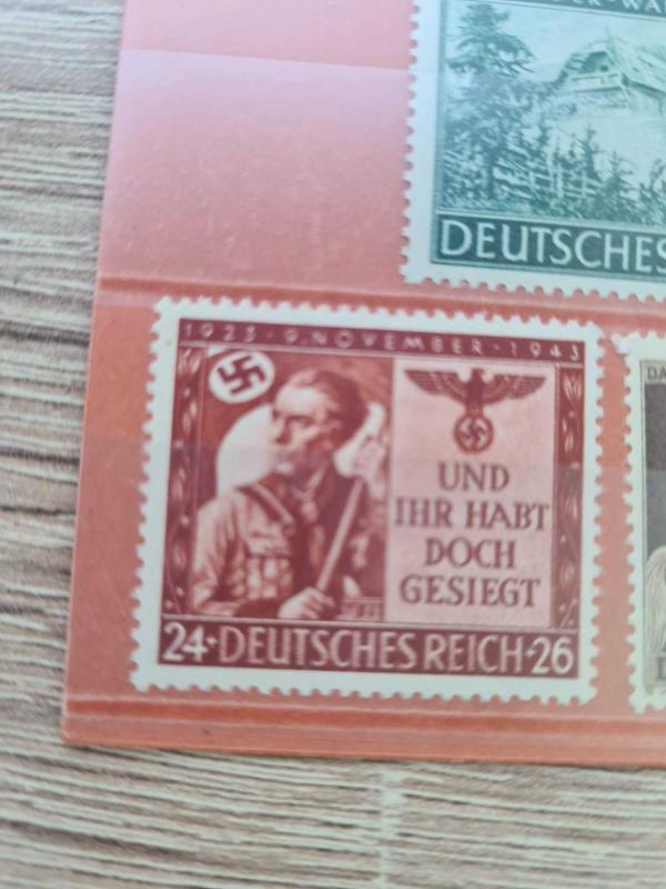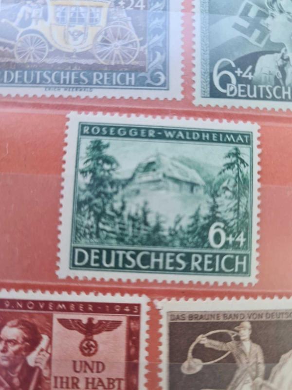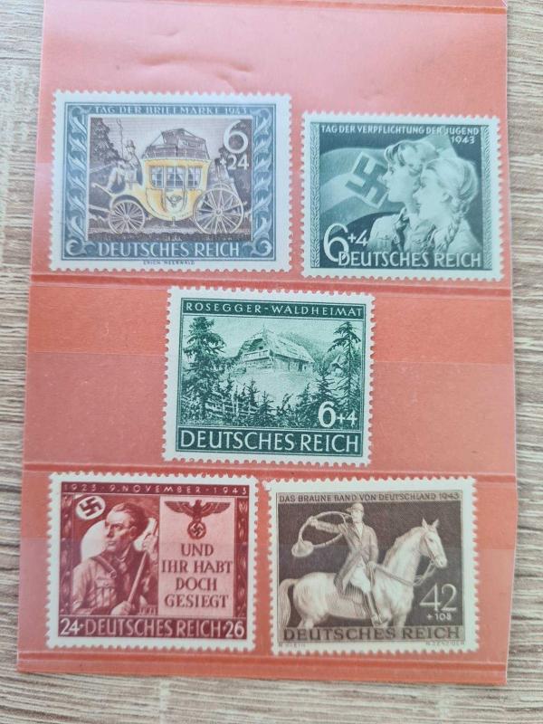 Sette bulunan pullar: 1- “TAG DER BRIEFMARKE 1943” (Posta Pulu Günü 1943) Değer: 6 + 24 Tasarım: Eski posta dili / posta arabası (sarı posta dillijansı). Not: “+24” ek değer, rejime bağış payını gösterir. Filateli temalı olduğu için koleksiyoncular arasında çok sevilir. 2- “TAG DER VERPFLICHTUNG DER JUGEND 1943” (Gençliğin Yemin Günü 1943) Değer: 6 + 4 Tasarım: Genç kız ve erkek figürü, arkada büyük bayrak. Konu: Nazi gençlik örgütleri için propaganda. Gençlik vurgulu görseller bu serinin en çok arananlarından. 3- “ROSEGGER – WALDHEIMAT” (Peter Rosegger / Orman Yurdu) Değer: 6 + 4 Tasarım: Dağ kulübesi ve orman manzarası. Bu tip kültürel / vatan toprağı romantizmi temalı pullar genelde savaş ortasında moral propagandası olarak basılmıştır. 4- 9 Kasım 1943 Anma Pulu (“UND IHR HABT DOCH GESIEGT”) Değer: 24 + 26 Tarih şeridi üstte: “1923 – 9. November – 1943” Konu: 1923 Münih darbesinin (Beer Hall Putsch) yıldönümü propagandası. Kartal ve arma ile birlikte slogan. Bu pul doğrudan rejim mitolojisine bağlı olduğu için politik propaganda kategorisine giriyor. 5- “DAS BRAUNE BAND VON DEUTSCHLAND 1943” (Kahverengi Bant Yarışı) Değer: 42 + 108 Tasarım: At üstünde jokey / süvari. Konu: Rejimin himayesindeki prestijli at yarışı “Braunes Band” için basılan bağış pulu. Spor ve şan vurgusu. Kondisyon: Tümü damgasız, renkler parlak. Dişler (perforasyon) düzgün; kopuk diş, yırtılma yok Fotoğrafta görüldüğü gibi çok temiz ve vitrine çıkacak seviyede. MNH kategorisinde Neden koleksiyonluk? Bunlar düz “Hitler kafa” rutin posta pulları değil; her biri belli bir gün/etkinlik/propaganda için basılmış yarı-postal (üzerinde “+” ile ek bağış tutarı var). 1943 gibi savaşın sert dönemine ait olmaları, temaların açıkça propaganda ve moral amaçlı olması bu grubu tarihsel olarak daha ilginç yapıyor. Hepsinin bir arada olması, özellikle “Posta Pulu Günü”, “Gençlik Yemini”, “Braunes Band” gibi farklı temaları tek sette görme şansı verdiği için avantaj.