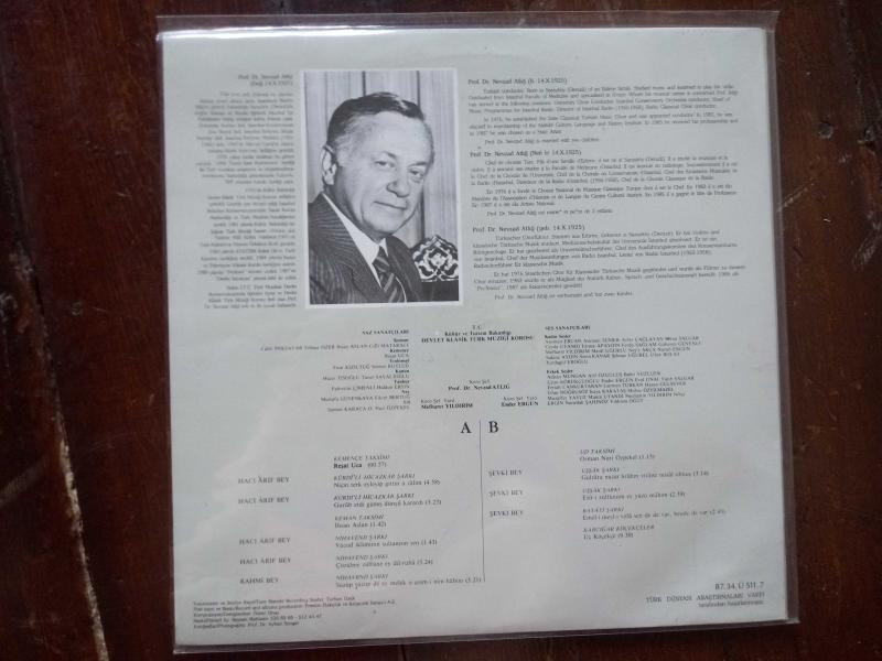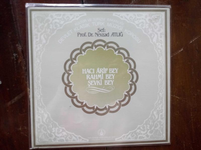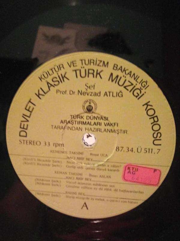 T.C. Kültür ve Turizm Bakanlığı Devlet Klasik Türk Müziği Korosu Koro Şefi: Prof. Dr. Nevzat Atlığ Vinyl, LP, Stereo A yüzü Kemençe Taksimi Reşat Uca * 00.57 A1 Kürdi'li Hicazkar Şarkı (Niçin terk eyleyip gittin a zalim) Hacı Arif Bey* 4:58 A2 Kürdi'li Hicazkar Şarkı (Gurub etdi güneş dünya karardı) Hacı Arif Bey* 3:23 Keman Taksimi İhsan Aslan 1.42 A3 Nihavend Şarkı (Vücud ikliminin sultanı sensin) Hacı Arif Bey 3:51 A4 Nihavend Şarkı (Çözülme zülfüne ey dil-ruba) Hacı Arif Bey 3:24 A5 Nihavend Şarkı (Süzüp süzüp de ey melek o çeşm-i nim-habını) Rahmi Bey 3:21 B Yüzü Ud Taksimi Osman Nuri özpekel *1.13 B1 Uşşak Şarkı (Gülzara nazar kıldım virane misal olmuş) Şevki Bey* 3:14 B2 Uşşak Şarkı (Esir-, zülfünüm ey yüzü mahım) ) Şevki Bey* 2:39 B3 Beyati Şarkı (Emel-i meyl-i vefa sen de de var, bende de var) Şevki Bey* 2:43 B4 Evc-Ara Saz Semaisi Dil-Hayat Hanım*5:30 Karcığar Köçekçeler Üç köçekçe* 9.30