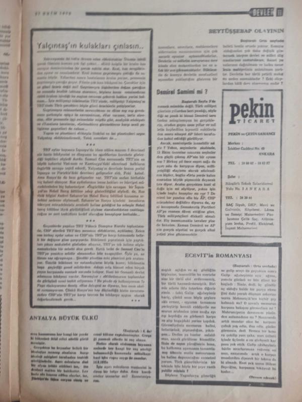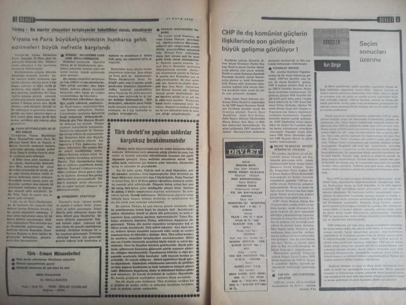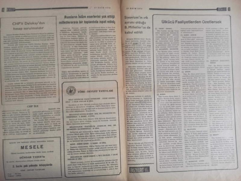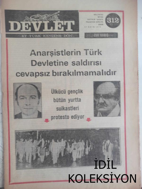 Devlet Milliyetçi Siyasi Haftalık Gazetesi - 27 Ekim 1975 - Sayı:312 - Anarşistlerin Türk Devletine Saldırısı Cevapsız Bırakılmamalıdır - Viyana ve Paris Büyükelçilerimizin Hunharca Şehit Edilmeleri Büyük Nefretle Karşılandı - Türk Devleti'ne Yapılan Saldırılar Karşılıksız Bırakılmamalıdır - Seçim Sonuçları Üzerine - Nuri Gürgür - Ecevit Safranbolu'da Soru Soran Genci CHP Militanlarına Verdiği Emirle Dövdürdü - Antalya Büyük Ülkü Derneği Beraat Etti - AP ve Seçimler - CHP Sabotajcıların Suç Ortağıdır - Ahmet Rıfat - Yumuşama Politikası Kimin İşine Yarıyor? - Erdal Altay Balkanlı - CHP'li Dalokay'dan Hesap Sorulmalıdır - Ülkücü Faaliyetlerden Özetlersek - İspanya'dan Öğüt Alanlar - İdeal Buhranı ve Milliyetçilik - Mehmet Ulaş - Antalya Büyük Ülkü Beytüşşebap Olayı - Ülkücülerin Komünistler Karşısında Ezilmeyişinin Sebebi, İnandıkları Yolda Ölümü Hiçe Saymalarıdır fotoğraf ve haberi - Tam Takım Gazete Yıpranma, sararmalar, kupon kesiği ve yırtılmalar zamana bağlı olarak görülebilir