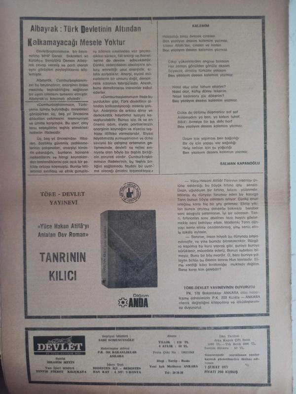 Devlet Milliyetçi Siyasi Haftalık Gazetesi - 7 Şubat 1977 - Sayı:379 - Devletbaşkanı Korutürk'ün Beyanatı Olumlu Karşılandı - Fitneye Taviz Vermekle Fitne Önlenmez - Gül Bahçesi - Abdülhadi Topallıoğlu - Arada Bir Sohbet - Kültür ve Medeniyet - Ahmet Arvasi - Komünist Grupların En Silahlı ve Vurucu Teşkilatı Olan THKP-C'nin Bir Hücresi Daha Açığa Çıkarıldı - Diyanet İşlerinde Neler Oluyor - Bir Yabancı ve İsmet Hürmüzlü - Emine Işınsu - Kooperatifçilik ve Türkiye'de Tatbikat - Kooperatiflerde Yapılan Suistimaller - Sadık Cemile - Oktay Çetinkaya - Mehmet Sarıaslan - Ocak Ayında Şehit Edilen Ülkücüler - İlim ve Türk Milliyetçiliği - Ayhan Tuğcugil - Türk Devletinin Altından Kalkamayacağı Mesele Yoktur - Salman Kapanoğlu fotoğraf ve haberi - Tam Takım Gazete Yıpranma, sararmalar, kupon kesiği ve yırtılmalar zamana bağlı olarak görülebilir