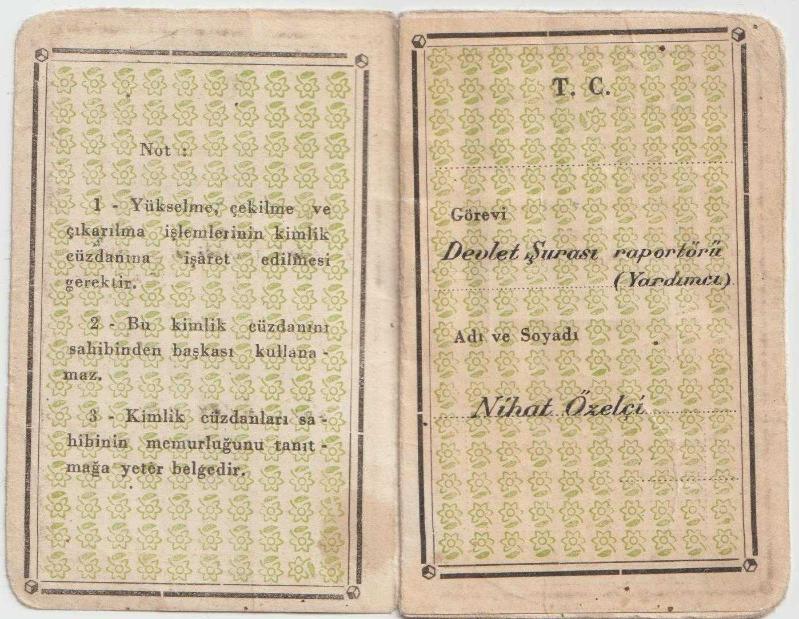 Devlet Şurası Raportörü Memur Hüviyet Cüzdanı Nihat Özelçi
