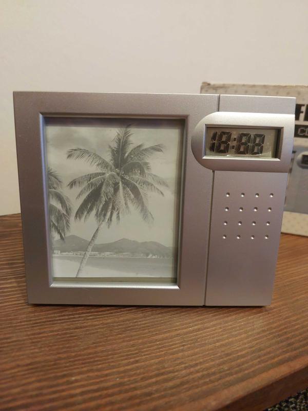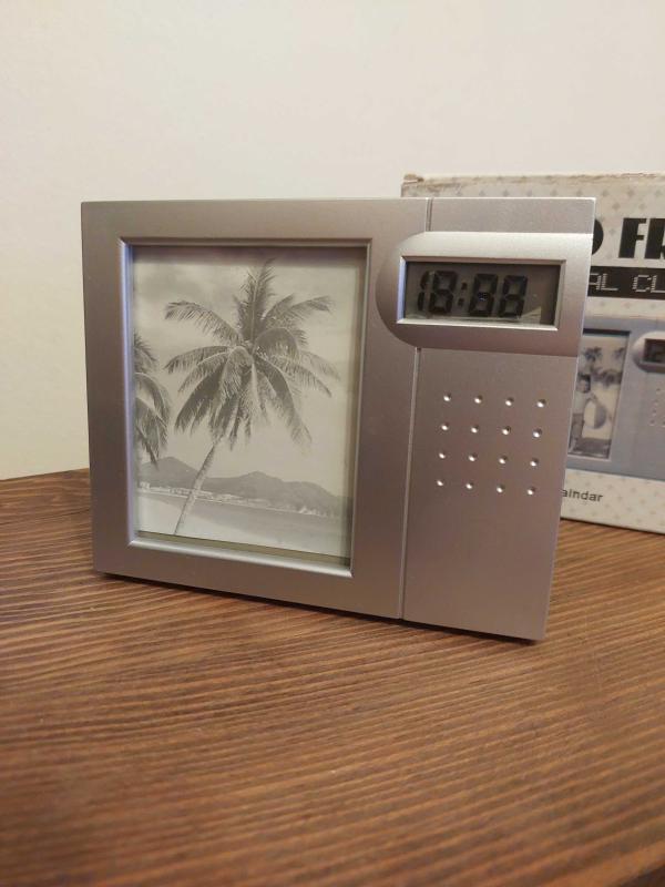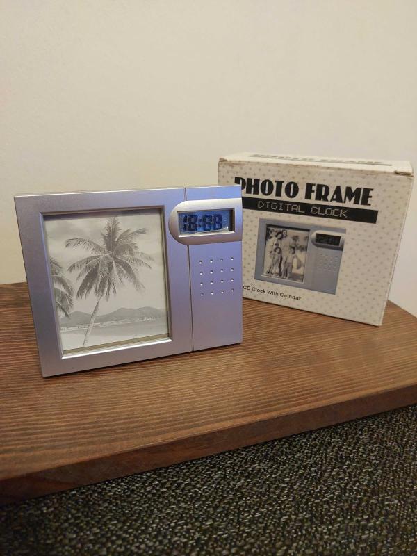 Dijital saat ve fotoğraf çerçevesi bir arada. Şık tasarımıyla masaüstünüzde veya rafınızda hoş bir görünüm sunar. Fotoğrafınızı sergilerken aynı zamanda saati takip etmenizi sağlar.Eni 13 Cm Boyu 10 Cm'dir.Hiç kullanılmamıştır.Kendi orijinal kutusundadır.Bir adet ince kalem pil ile çalışmaktadır.Diğer ilânlarımı incelemeyi unutmayınız.