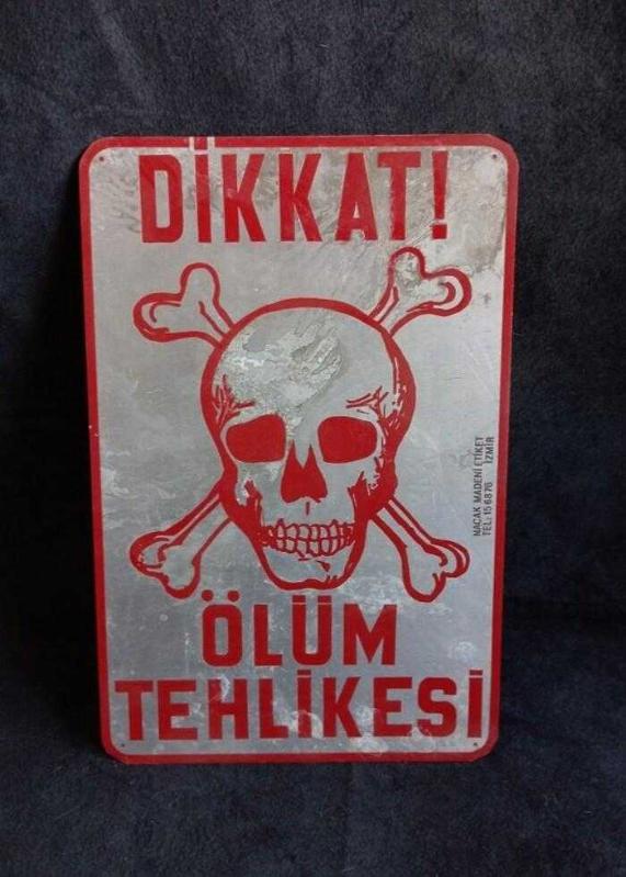 Dikkat ölüm tehlikesi tabelasi başlıklı antika/koleksiyon objesi Türkiye menşe’lidir. Objenin ait olduğu dönem bilinmeketedir.