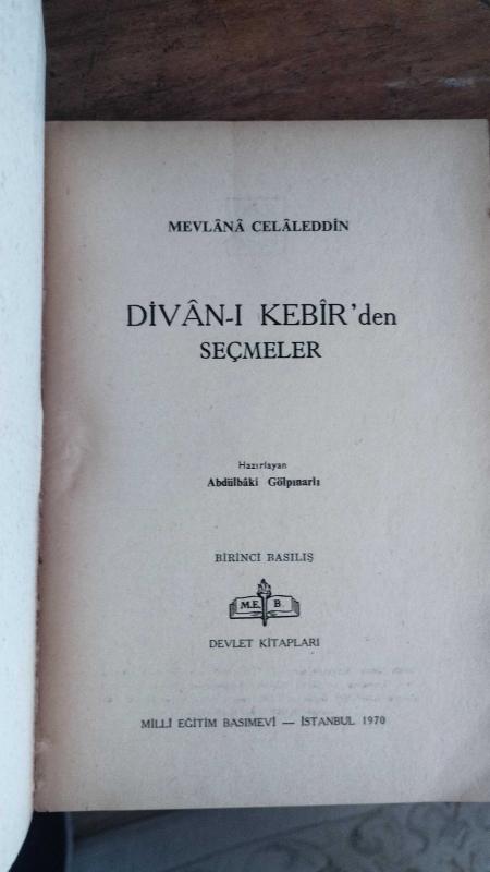 Divan_ı Kebir, Mevlana Celaleddin tarafından kaleme alınmıştır. Eser Abdülbaki Gölpınarlı editörlüğünde hazırlanmıştır. Kitap 1970 yılında Devlet Kitapları tarafından yayınlanmıştır. 169 sayfadır. Divan_ı Kebir adlı eser Türkçe dilindedir.