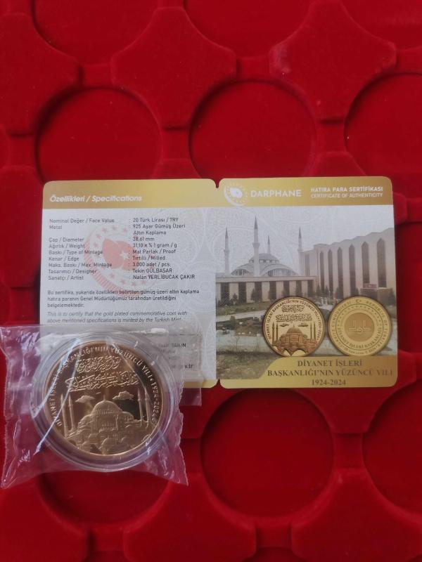 Diyanet işleri başkanlığı yüzüncü yılı ALTIN KAPLAMA hatıra parası. Sertifikalı, Çil.