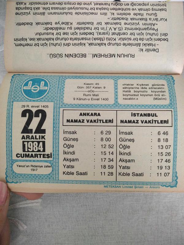 Diyanet takvimi - 22 Aralık 1984 - doğum günü hediyesi hediyelik takvim yaprağı, en son 2 yıl önce güncellenmiştir.