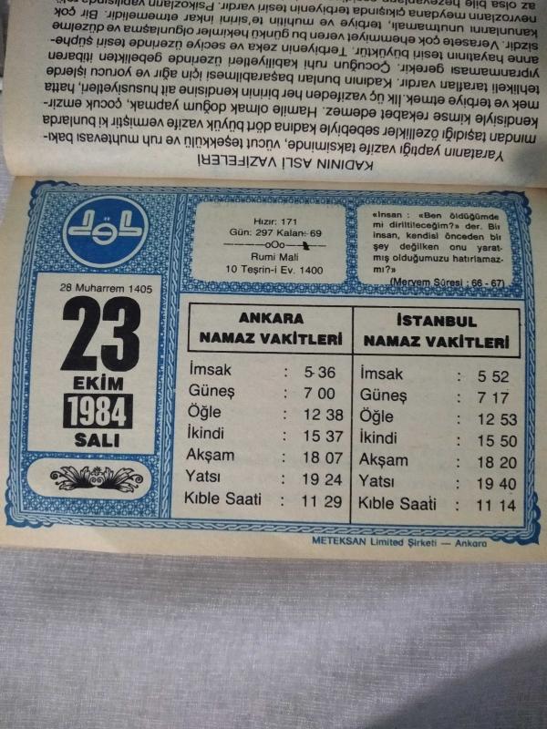 Diyanet takvimi - 23 Ekim 1984 - doğum günü hediyesi hediyelik takvim yaprağı, en son 2 yıl önce güncellenmiştir.