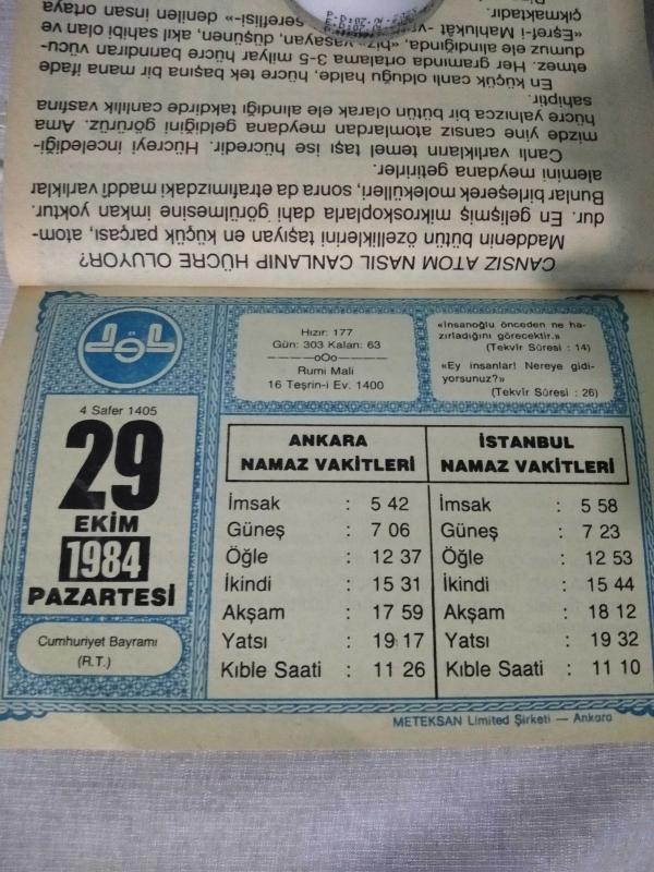Diyanet takvimi - 29 Ekim 1984 - doğum günü hediyesi hediyelik takvim yaprağı, en son 2 yıl önce güncellenmiştir.