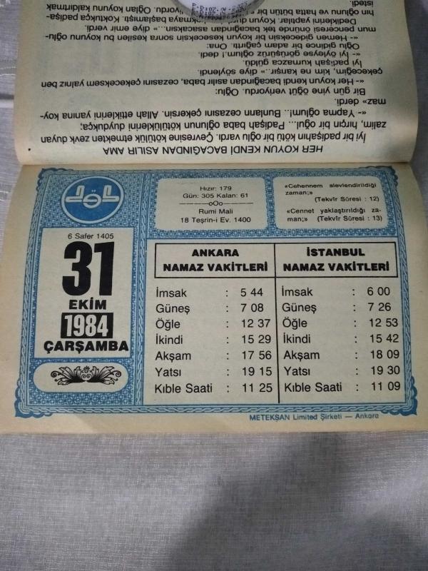Diyanet takvimi - 31 Ekim 1984 - doğum günü hediyesi hediyelik takvim yaprağı, en son 2 yıl önce güncellenmiştir.