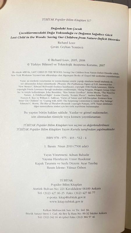 Doğadaki Son Çocuk - Richard Louv - Tübitak, Richard Louv tarafından kaleme alınmıştır. Kitap 2010 yılında Tübitak tarafından [Ankara] 9789754035124 ISBN kodu ile yayınlanmıştır. Satışta olan kitap, yayınevinin 1. baskısıdır. Bu baskının çevirisi Ceyhan Temürcü tarafından yapılmıştır. 447 sayfadır. Sayfa bilgisi 2. Hamur olarak belirtilmiştir. Doğadaki Son Çocuk - Richard Louv - Tübitak adlı eser Türkçe dilindedir.