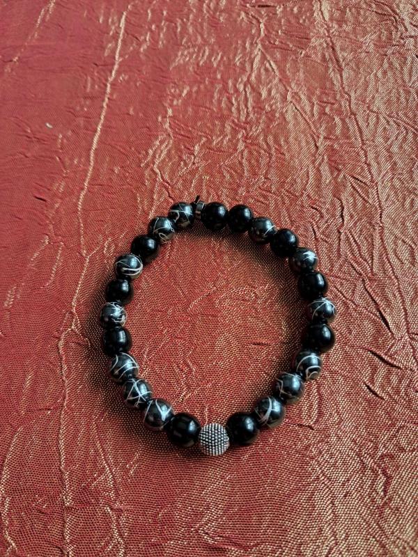 Onix Desenli Hematit ve Metal boncuklar kullanılmıştır.
