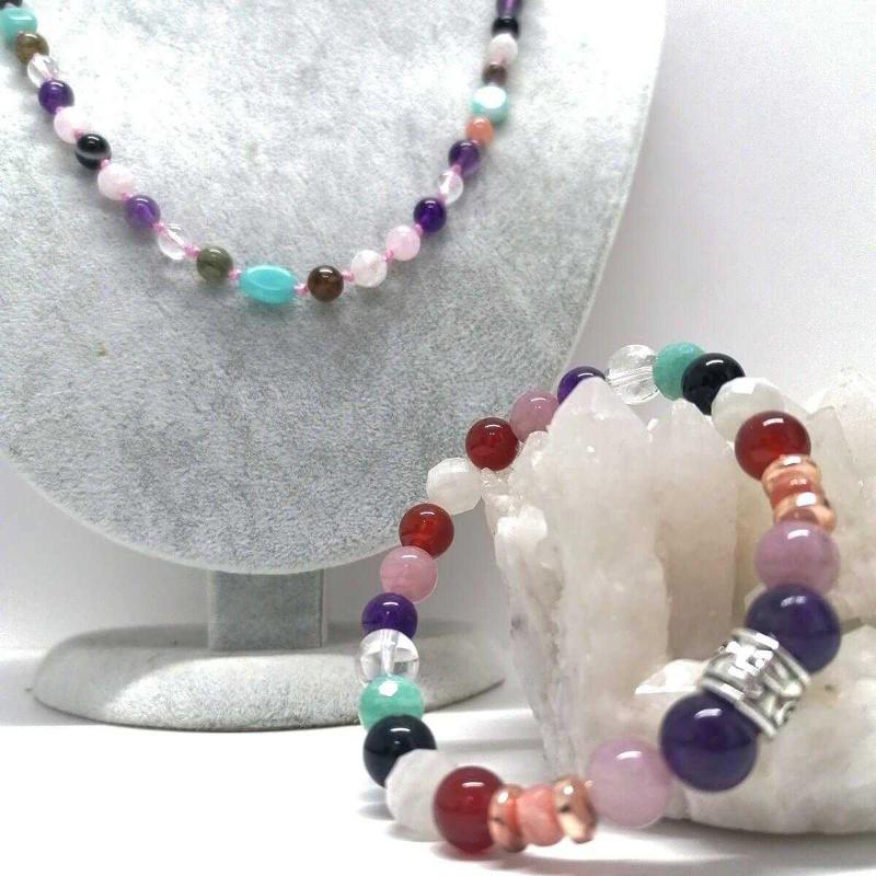 Doğal Taş Takı Seti - Kadınlara Özel Aşk Seti Ametist (Pozitif Enerji Taşı) : Negatif enerjiyi vücuttan temizlemeye yardımcı olup, pozitif enerji üretir. Pembe kuvars (Sevgi Taşı) : Mutluluk duygusu verir. Özgüven duygusunu arttırır. Kalbi hastalık ve travmalara karşı korur. Akik (Stres Taşı) : Nazara karşı koruma sağlar. Strese iyi gelir. Tansiyonu dengeler. Ay Taşı (Dengeleyici Taş) : Metabolizmayı hızlandırarak kilo vermeye yardımcı olur ve tokluk hissi verir. Aşk taşı olması nedeni ile evliliklerdeki bağı güçlendirir.duygusal dalgalanmaları dengeler. Yaşama sevinci verir. Turmalin (Odaklanma Taşı) :Denge ve uyum sağlar. Kişinin amaçlarına odaklanmasına yardımcı olur. Duygusal iniş çıkışları engeller. Rodokrozit (Aura Taşı) : Duygusal kırılmalara ve panikatağa karşı etkilidir. Kişinin yaşamına sevgi duygusunu katmasını sağlar. Amazonit (Uyum Taşı) : Çiftler arasında uyumu dengeler. Aşk ve sevgiyle ilgili iletişim becerisini arttırır. Kristal kuvars (+Enerji Taşı) : Negatif enerjiyi dağıtır. Pozitif enerji ve rayasyonu toplar. Sevgi ve şefkat duygularını güçlendirir.