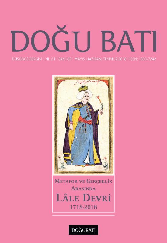 SUNUŞ / Mehmet Özden / 300 Yılın Ardından; Metafor ve Gerçeklik Arasında Lâle Devri / GENEL BAKIŞ / Can Erimtan / Ahmed Refik’in Lâle Devri’ni Yazarken Kullandığı Kaynaklar ve ‘Lâle Devri’ Paradigması / Jane Hathaway / 18. Yüzyıl Osmanlı Tarihi’ni Yeniden Yazmak / Gül İrepoğlu / Lâle Devri’ne Doğu’dan ve Batı’dan Bakmak: Levnî ile Vanmour / MÜTEFERRİKA’NIN MATBAASI Orlin Sabev (Orhan Salih) / Lâle Devri, İbrahim Müteferrika ve Osmanlı Türk Matbaacılığının İlk Adımları / “PARİS’E GİT HEY EFENDİ AKL U FİKRİN VÂR İSE / ÂLEME GELMİŞ SAYILMAZLAR GİTMEYENLER PARİS’E” / Güneş Işıksel / Yirmisekiz Çelebi Mehmed Fransa’da / Aytaç Yıldız / Yirmisekiz Çelebi Mehmed Paris’e Neden Gitti? / DAMAD / SADRAZAM / ELÇİ / Ünal Araç / Politik Söylem ve Kamusal Temsil Aracı Olarak Himâye / Nagihan Gür / ‘Lâle Devri’nde Yetişmiş Kudretli Bir Sanat Hâmisi: Hekimoğlu Ali Paşa ve Şairleri / Seda Erkoç / ‘Lâle Devri’nin Son Demlerinde İstanbul’da Elçi Olmak: Lord Kinnoull / PATRONA İSYANI / Hakan Yılmaz / Patrona Vak‘ası Hakkında Yazılmış Kısa Kronikler ve Devrin Vak‘anüvisi Küçük Çelebi-zâde İsmâil ‘Âsım’ın “Tārīhçe”si / Robert W. Olson / Esnaf ve Patrona Halil İsyanı (1730): Osmanlı Siyasetinde Bir Eksen Kayması mı? / LÂLE / Özlem Kumbar / “Lâle Devri”nin Lâle’si / Hülya Bulut / Nedim ve Levnî ile Hayat Bulan Lâleler / Neslihan Koç Keskin / Yeni Bilgiler Işığında Osmanlı Lâlesi / MİMARÎ / POLİTİKANIN PSİKOLOJİSİ / Emre Demirel / 18. Yüzyıl Osmanlı Toplumunda Yaşanan Sosyal Değişim ve Nurosmaniye Cami / Mehmet Yaşar Ertaş / Lâle Devri’ne Yeni Bir Yaklaşım Önerisi: Politik Psikoloji Perspektifi / Işılay Pınar Özlük / Lâle’nin Seyri: Bir Çiçek, Bir Devir, Bir Çöküş