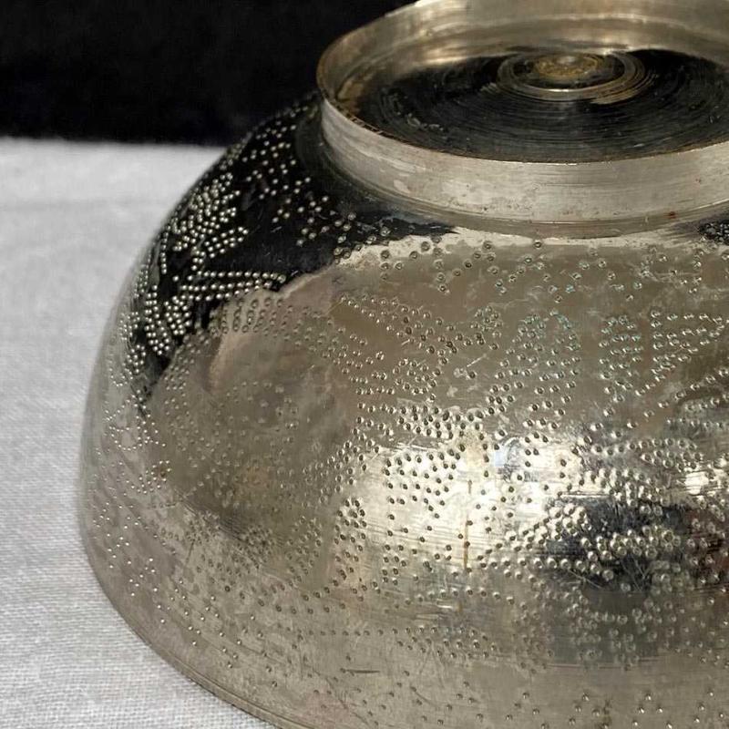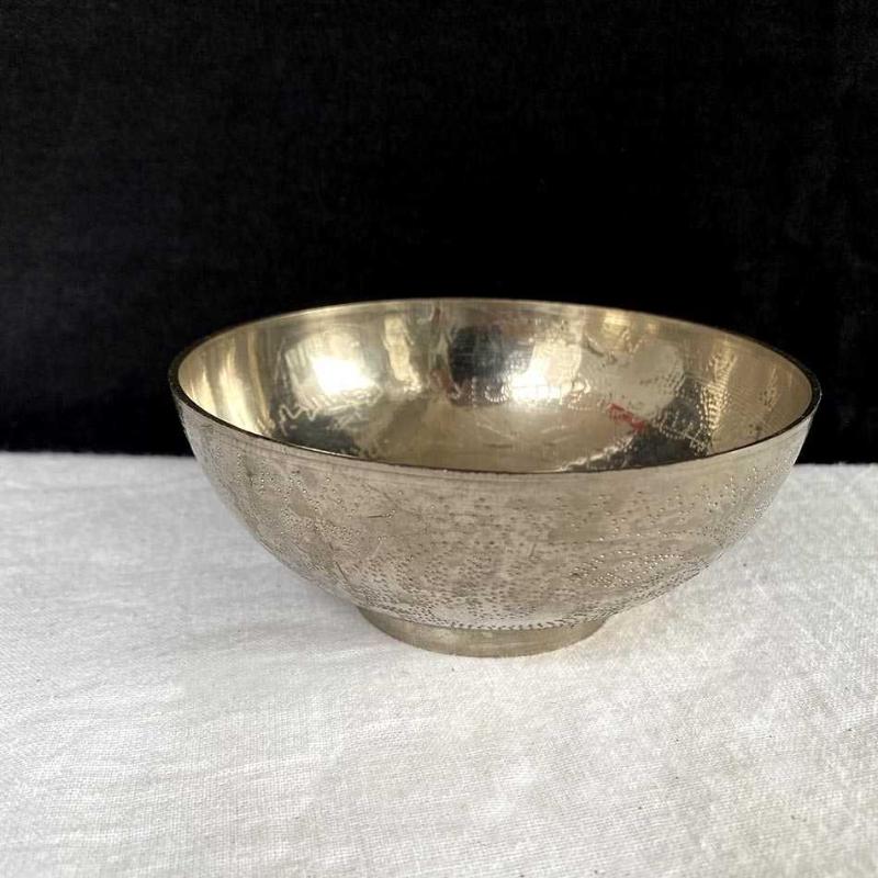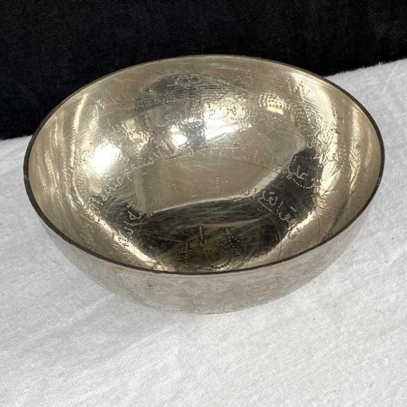 1980'ler Ortadoğu ürünü olan kase, dolu ve ağır pirinç malzeme üzerine kalem işçiliğiyle işlenmiş motiflere sahip. İç yüzeyine kalem işi ile dairesel formda işlenmiş Arapça dua yazısı bulunuyor. Zarif bir kır evi tarzı dekoratif eşya olan kase yaşına göre çok iyi durumdadır. Metal yorgunluğu veya form bozukluğu yoktur. Çap: 11 cm Yükseklik: 4.5 cm 170 gr