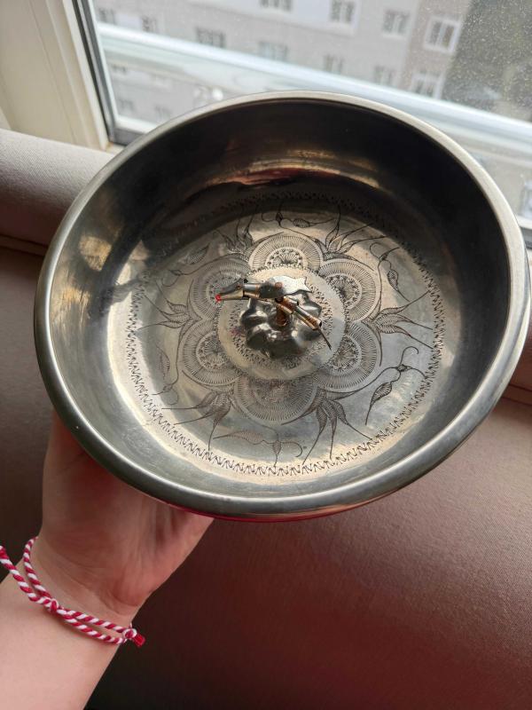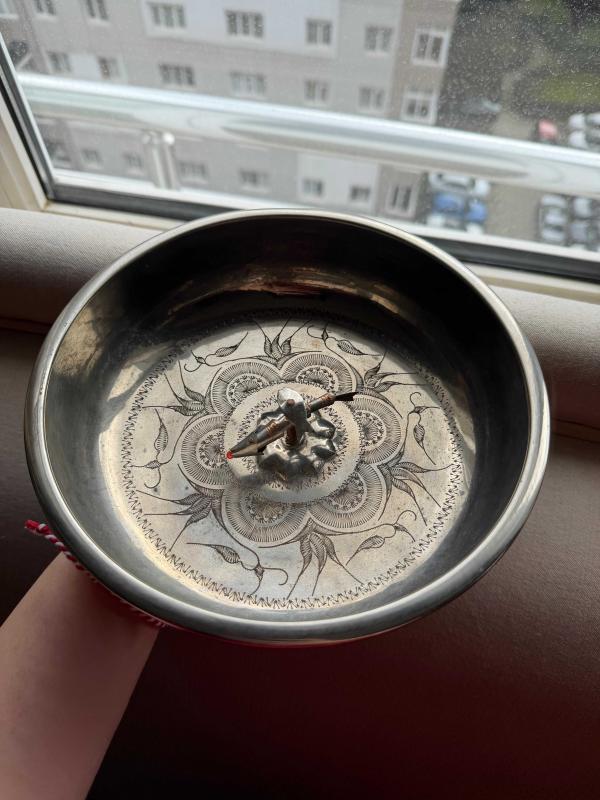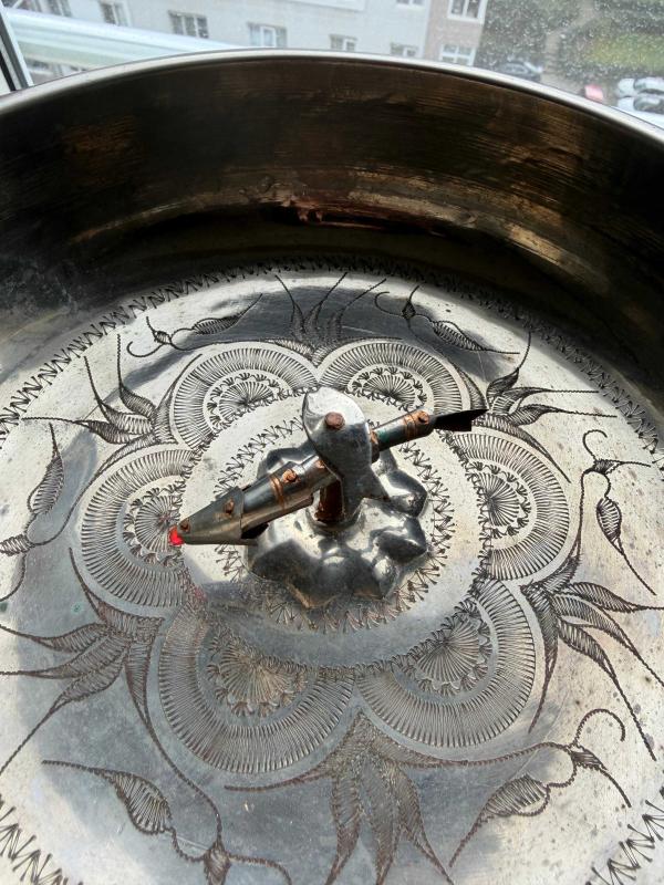 Gümüş renginde, dövme bakır, el işçiliği gravür desenlere sahip, ortasında balık figürünü bulunan antika hamam tası. Hiç kullanılmamıştır. Kondisyonu çok iyi durumdadır. Orta kısmındaki balık motifi hareket edebilir durumdadır.