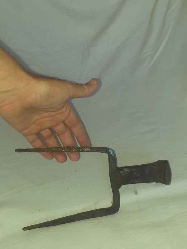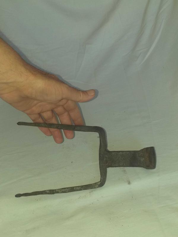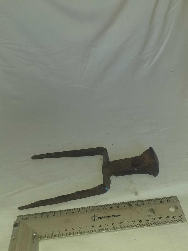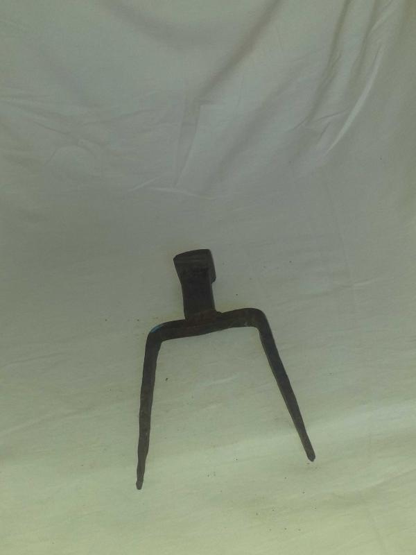 Çatal gibi görünen tarafı toprağa çakılarak sabitlenen ve portatif örs olarak kullanılan demir obje... Kullanım aleti , ethnografik sanat , ethnografic art... dövme demir , tırpan örsü