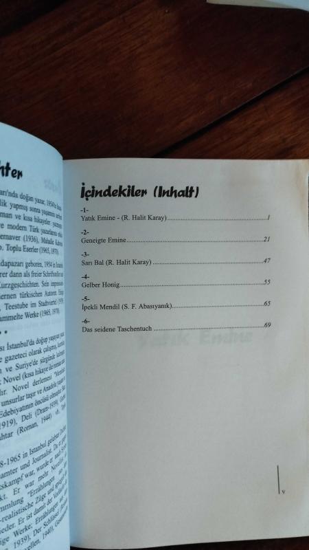 Eser Nazlı Özcan editörlüğünde hazırlanmıştır. Kitap 2003 yılında ODTÜ Yayıncılık tarafından yayınlanmıştır. 73 sayfadır. Drei Berühmte Türkishe Novellen - Üç Meşhur Türk Noveli adlı eser Almanca dilindedir. Eserin içeriğinde Türkçe dilinde bölümlere de yer verilmektedir.
