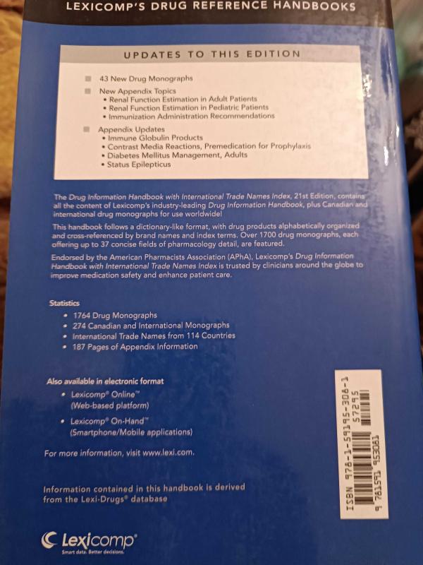Drug Information Handbook with International Trade Names Index, Lexi-Comp Inc. tarafından kaleme alınmıştır. Kitap Lexicomp tarafından yayınlanmıştır. Satışta olan kitap, yayınevinin 21. baskısıdır. Drug Information Handbook with International Trade Names Index adlı eser İngilizce dilindedir.