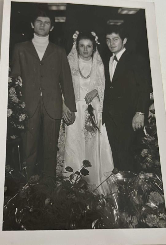 Düğün merasiminde çiçeklerle kaplı bir alanda poz veren gelin-damat ve yakının fotoğrafı.ORİJİNAL SİYAH & BEYAZ 14x 9cm EBADINDA - 1940'LAR, 1950'LER, 1960'LAR ve 1970'LER, en son 1 yıl önce güncellenmiştir.