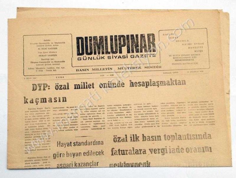 Dumlupınar günlük siyasi gazete, 10 Ağustos 1970 Kütahya adlı eser, Kitap > Süreli Yayınlar > Gazeteler > Türkiye > Mahalli kategorisinde İkinci El olarak satıştadır.