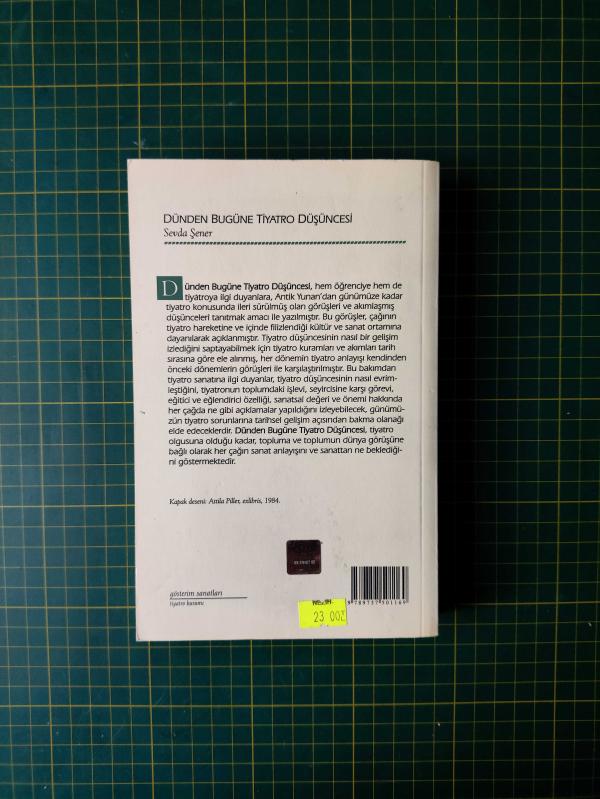 Dünden Bugüne Tiyatro Düşüncesi, Sevda Şener tarafından kaleme alınmıştır. Eser İnönü Bayramoğlu editörlüğünde hazırlanmıştır. Kitap 2010 yılında Dost Kitabevi Yayınları tarafından [Ankara] 9789757501169 ISBN kodu ile yayınlanmıştır. Bu baskının çevirisi Nur Yalçınkaya (Düzelti) tarafından yapılmıştır. Sayfa bilgisi 325+3 olarak belirtilmiştir. Dünden Bugüne Tiyatro Düşüncesi adlı eser Türkçe dilindedir.