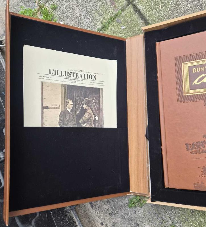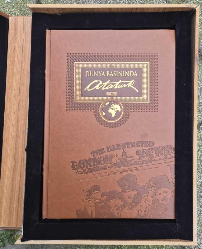 Prestij Boy: Dünya Basınında Atatürk (1912 - 1938) - Özel Muhafaza Kutulu Koleksiyonluk: Dünya Basınında Atatürk - Deri Ciltli, Büyük Boy Prestij Eser Nadir: Dünya Basınında Atatürk (1912-1938) - Kadife İç Hazneli Ahşap Kutulu Dünya Basınında Atatürk (1912 - 1938) Mustafa Kemal Atatürk’ün askeri ve siyasi dehasının dünya medyasındaki yansımalarını kronolojik olarak sunan, koleksiyon değeri yüksek prestij bir eserdir. İçerik: 1912 yılından vefatına kadar geçen süreçte; The Illustrated London News, L'Illustration gibi dünyanın önde gelen yayın organlarında çıkan haber, makale ve görsellerin tıpkıbasım derlemesini içerir. Cilt ve Kutu: Şık taba rengi deri (suni) cilt üzerine gofre baskılıdır. Ürün, iç haznesi siyah kadife kaplı, dışı ahşap görünümlü özel koruma ve sergileme kutusuyla birlikte gönderilecektir. Kondisyon: Kitap ve dış kutusu genel olarak çok iyi durumdadır. Sadece kutu köşelerinde zamana bağlı hafif sürtünmeler mevcuttur (Fotoğraflarda detaylıca gösterilmiştir). Sayfaları temiz, eksiksiz ve koleksiyonluk kondisyondadır. Boyut: Büyük boy (Prestij boy) olup kütüphane veya ofis sergilemesi için idealdir. Tarih meraklıları ve Atatürk koleksiyonu yapanlar için kaçırılmayacak, nitelikli bir eserdir. Ürün Durumu: Kitap genel olarak çok temizdir. Sadece kitabın sağ üst kapak köşesinde ufak bir deformasyon vardır fotografı görsellerde mevcuttur ve kutu içindeki eklerden L'Illustration belgeleri (2-3adet) eksik olduğu için fiyat uygun tutulmuştur. Kitap sayfaları içeriği tamdır ve kondisyonu kullanılmamış denebilir. Sadece 750 adet ilgili kitaptan basılmıştır.