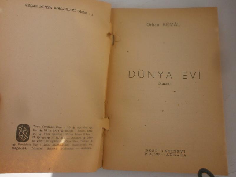 Dünya Evi, Orhan Kemal tarafından kaleme alınmıştır. Kitap 1958 yılında Dost Yayınevi tarafından [İstanbul] yayınlanmıştır. Satışta olan kitap, yayınevinin 1. baskısıdır. 237 sayfadır. Dünya Evi adlı eser Türkçe dilindedir.