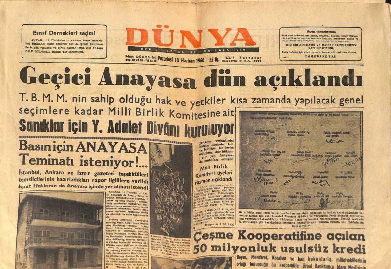 Dünya Gazetesi 13 Haziran 1960 - Geçici Anayasa Dün Açıklandı - ABD Türkiye'ye Bir Milyar Lira Veriyor GZ154009, en son 20 gün önce güncellenmiştir.